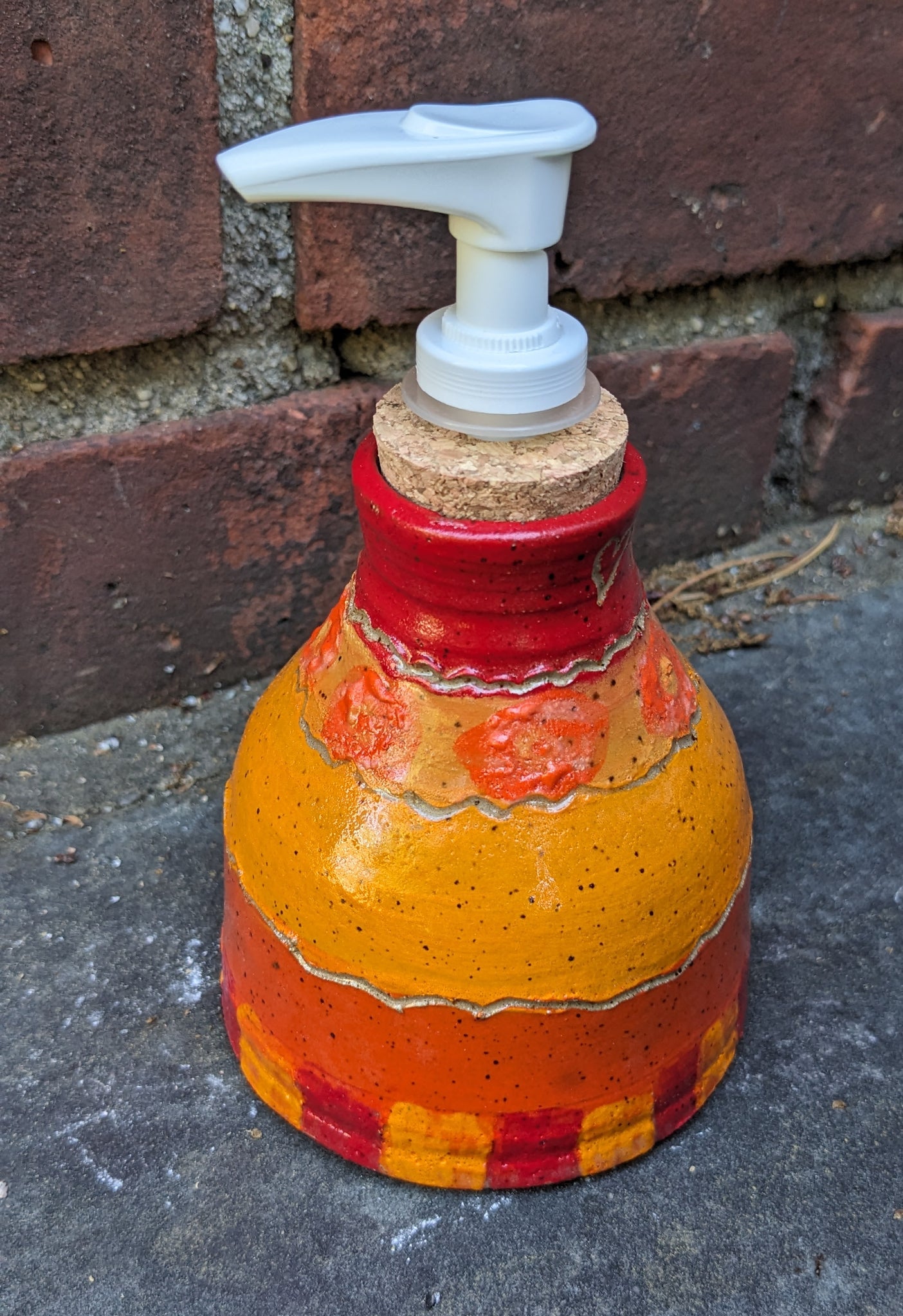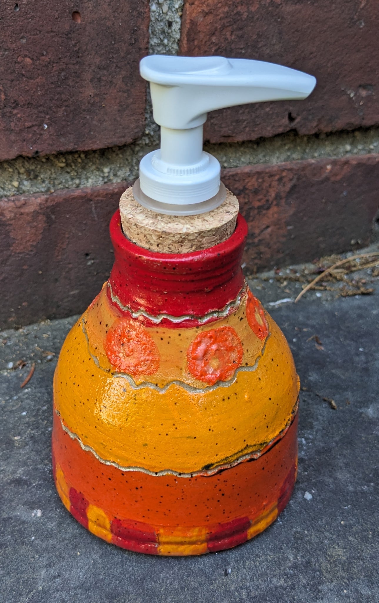 These soap dispensers were thrown on the wheel, handpainted with underglaze, fired in a kiln, covered in clear glaze, and fired again in a kiln.