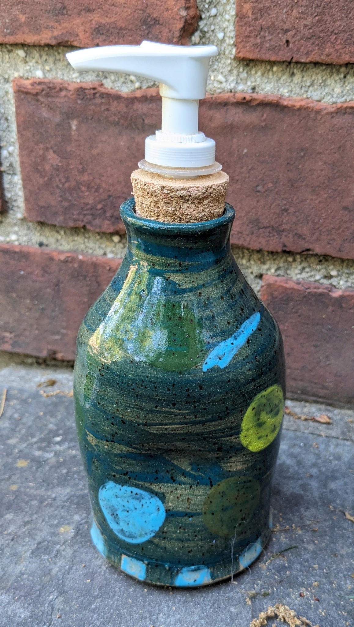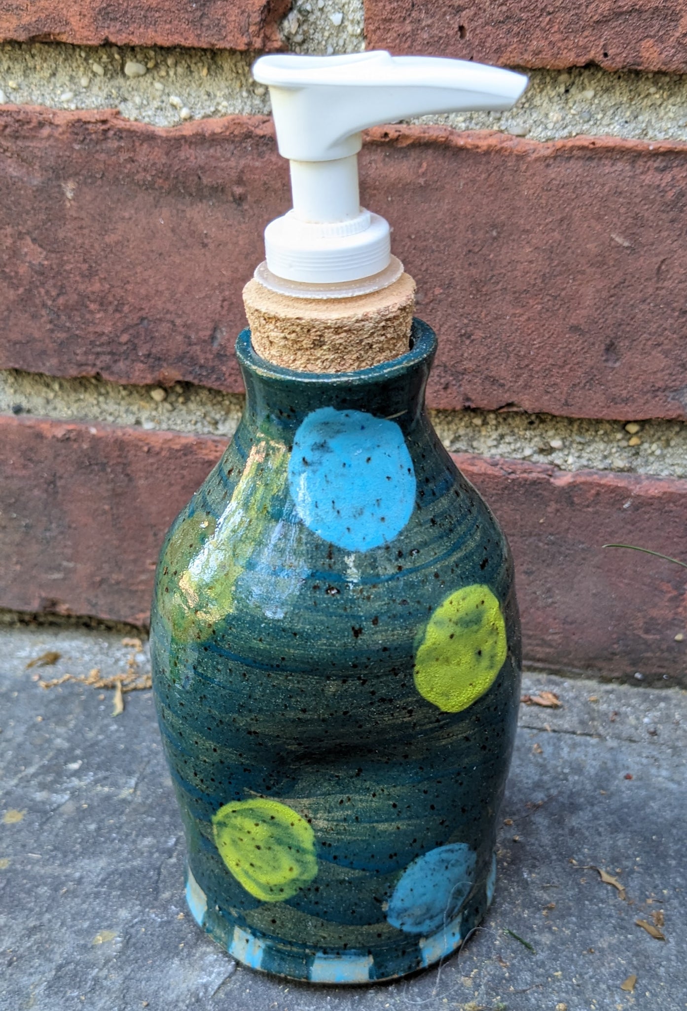 These soap dispensers were thrown on the wheel, handpainted with underglaze, fired in a kiln, covered in clear glaze, and fired again in a kiln.