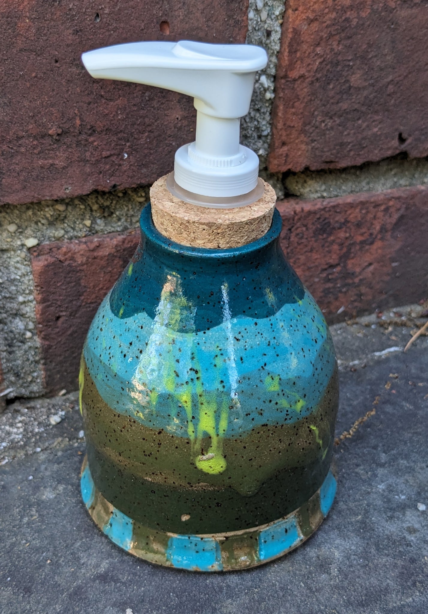 These soap dispensers were thrown on the wheel, handpainted with underglaze, fired in a kiln, covered in clear glaze, and fired again in a kiln.