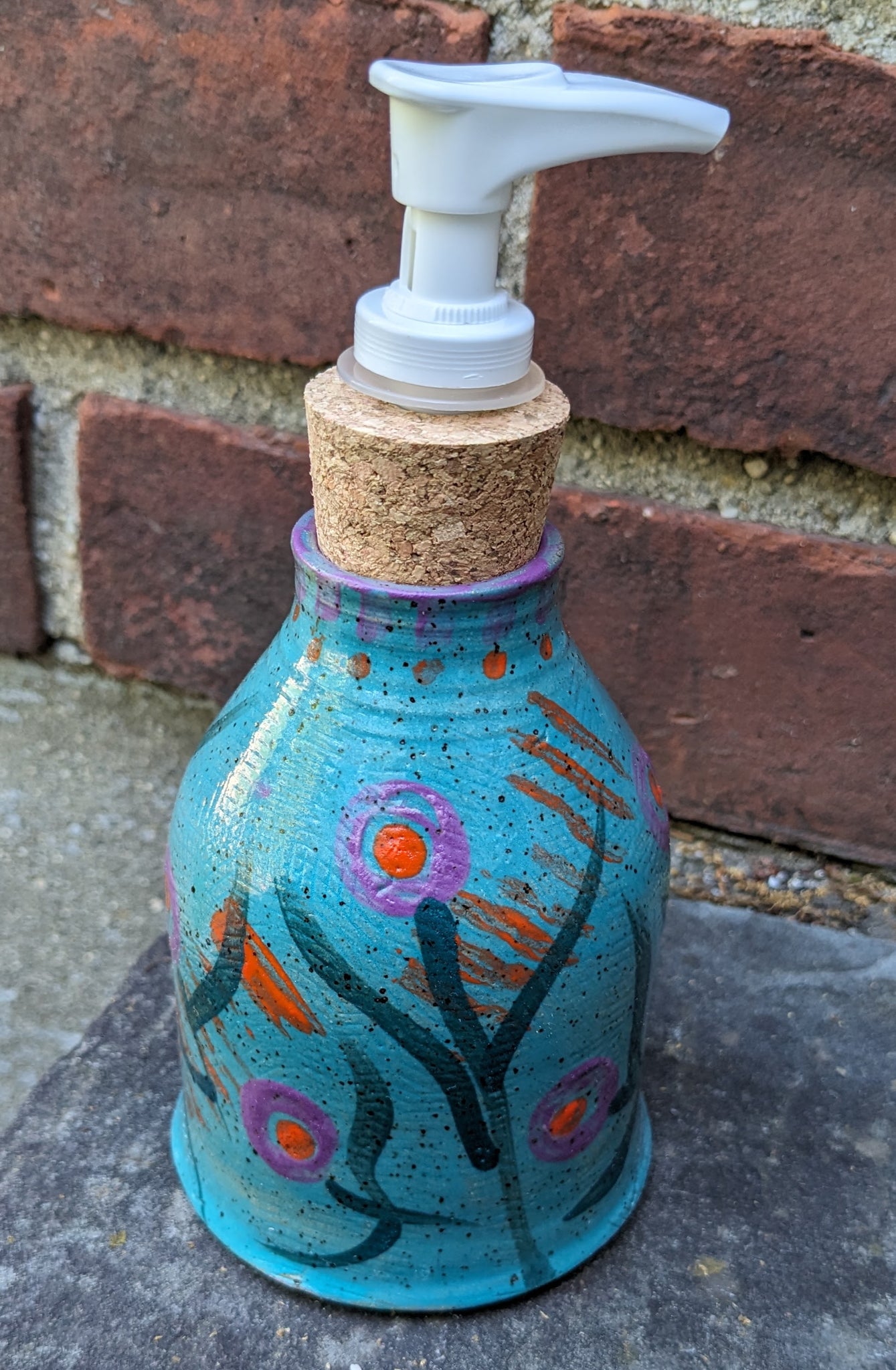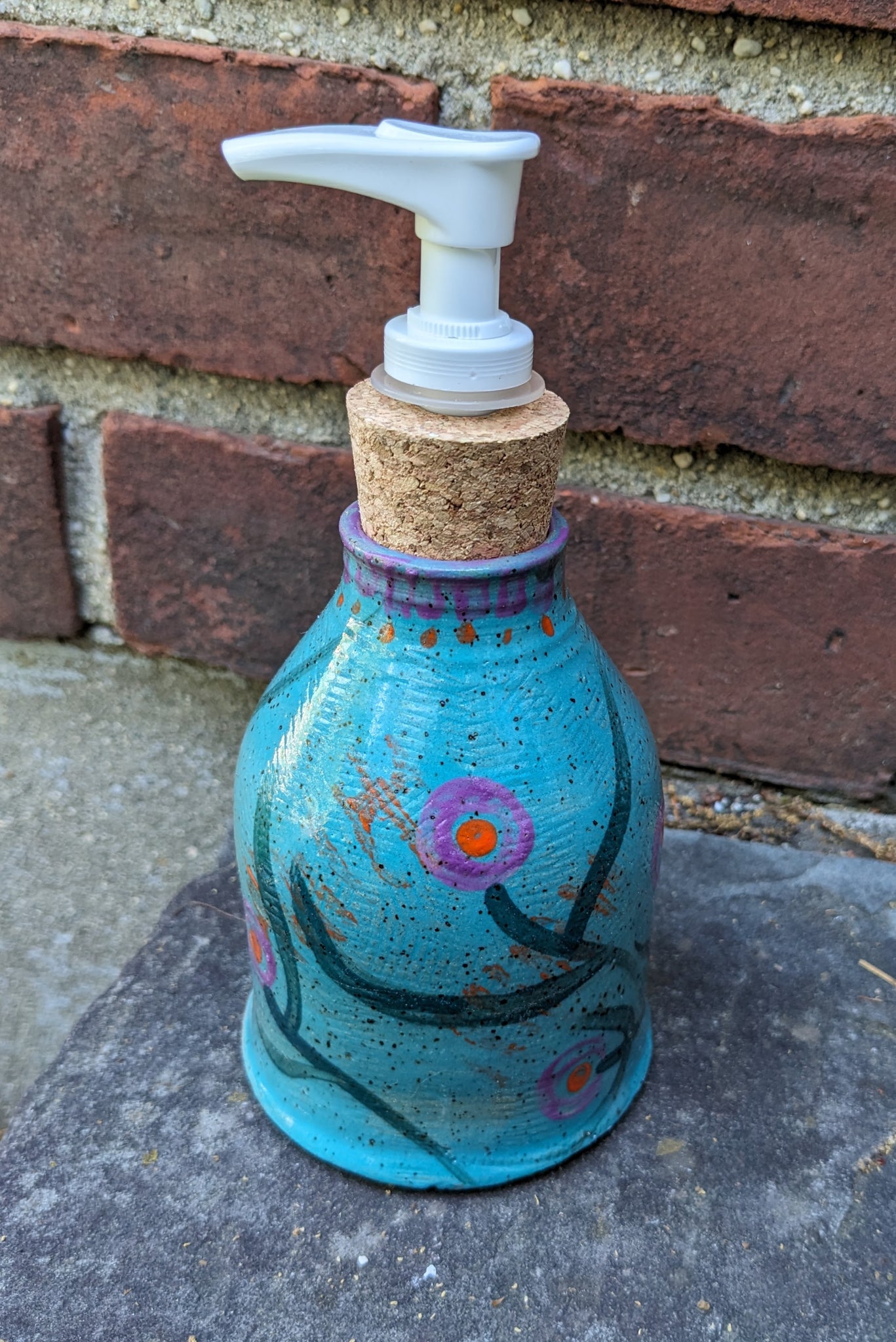These soap dispensers were thrown on the wheel, handpainted with underglaze, fired in a kiln, covered in clear glaze, and fired again in a kiln.