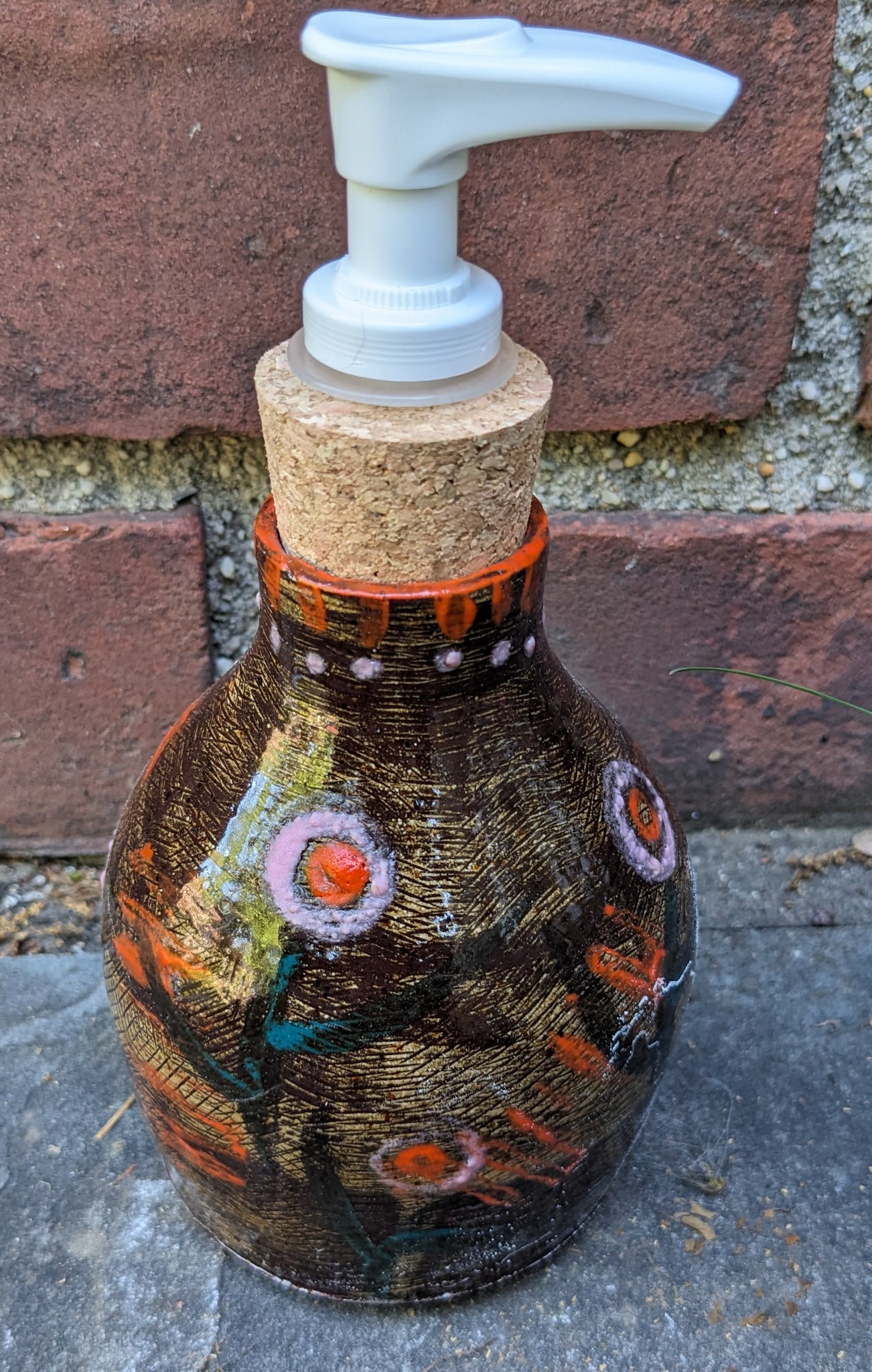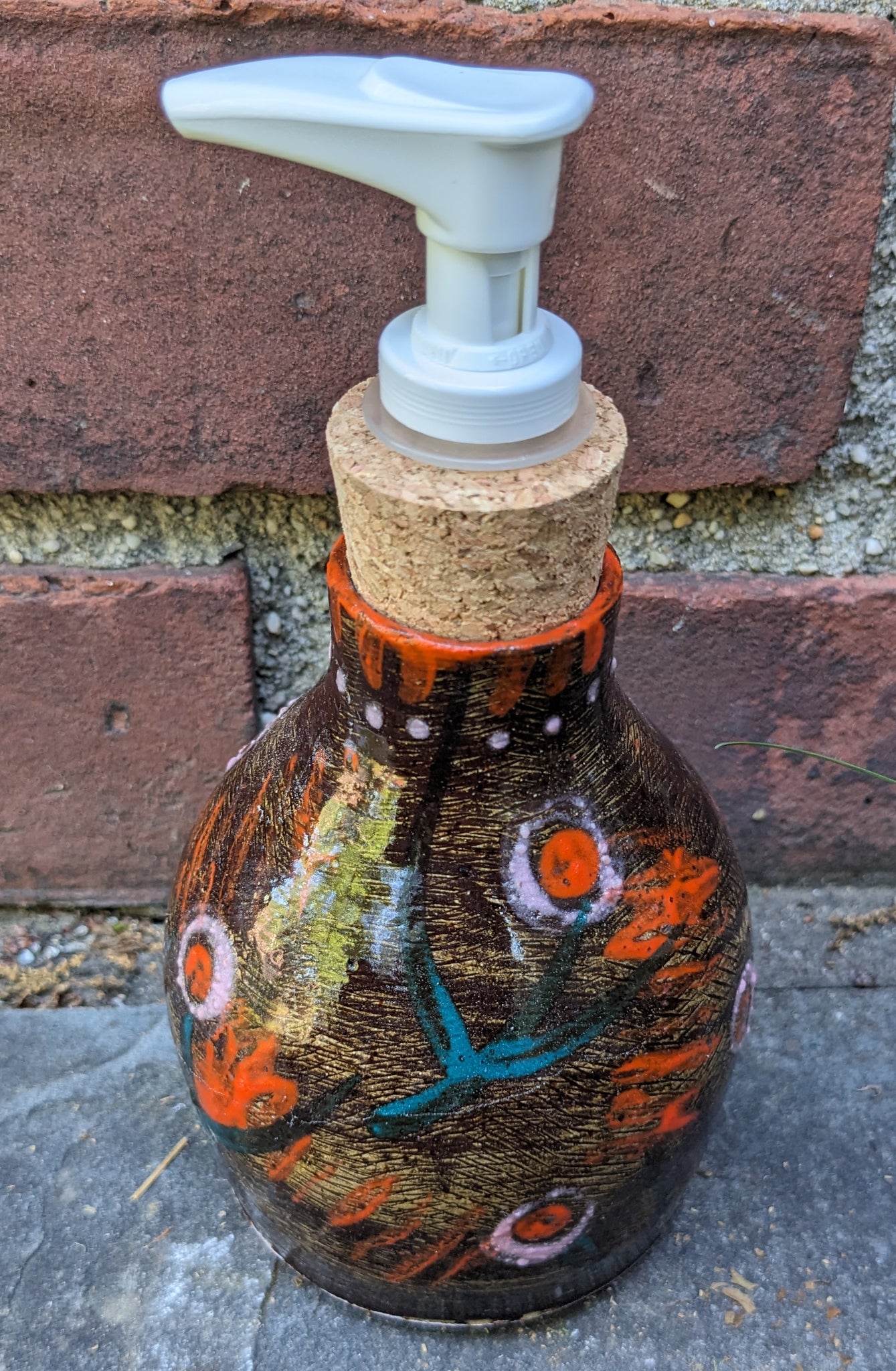 These soap dispensers were thrown on the wheel, handpainted with underglaze, fired in a kiln, covered in clear glaze, and fired again in a kiln.
