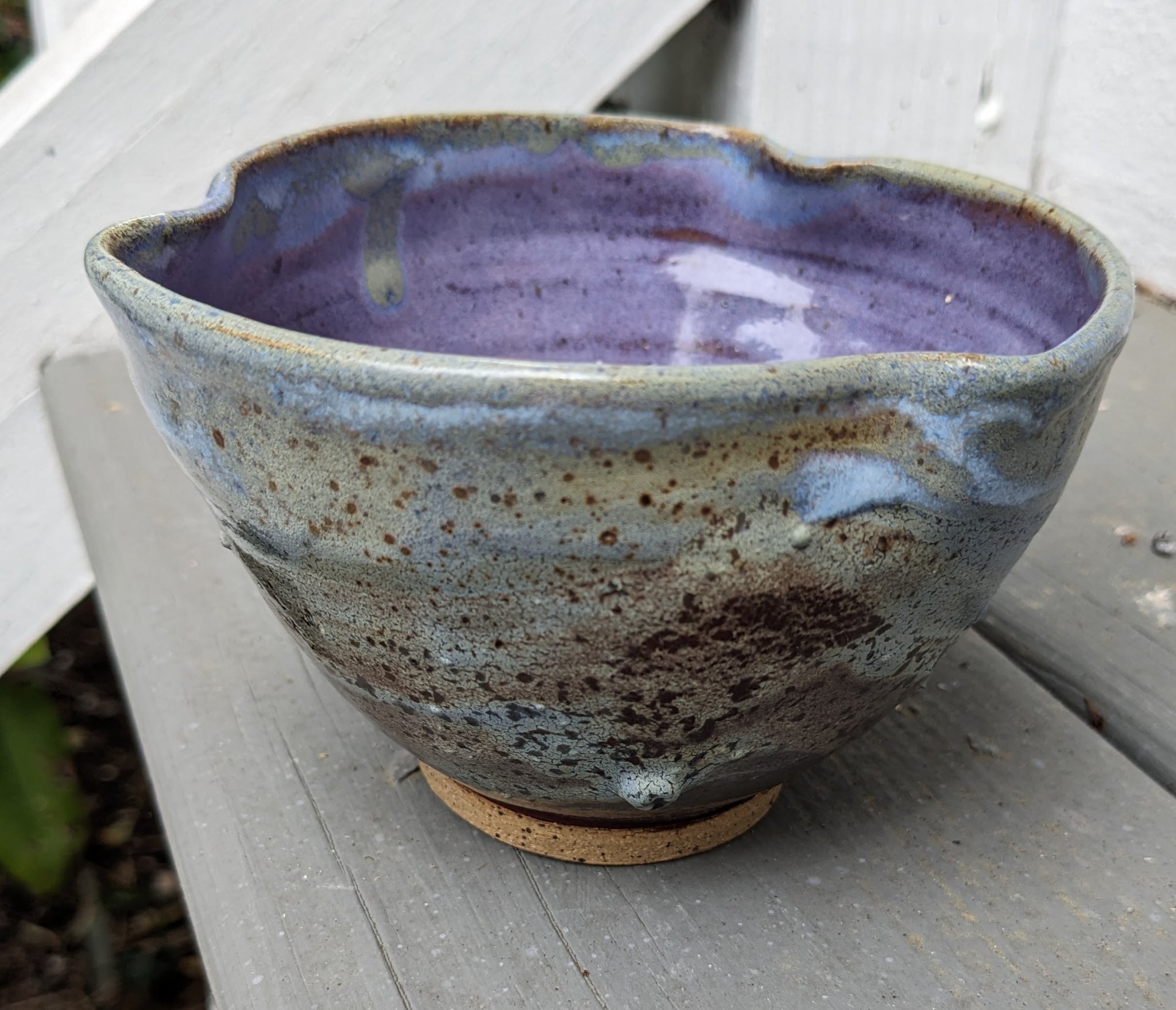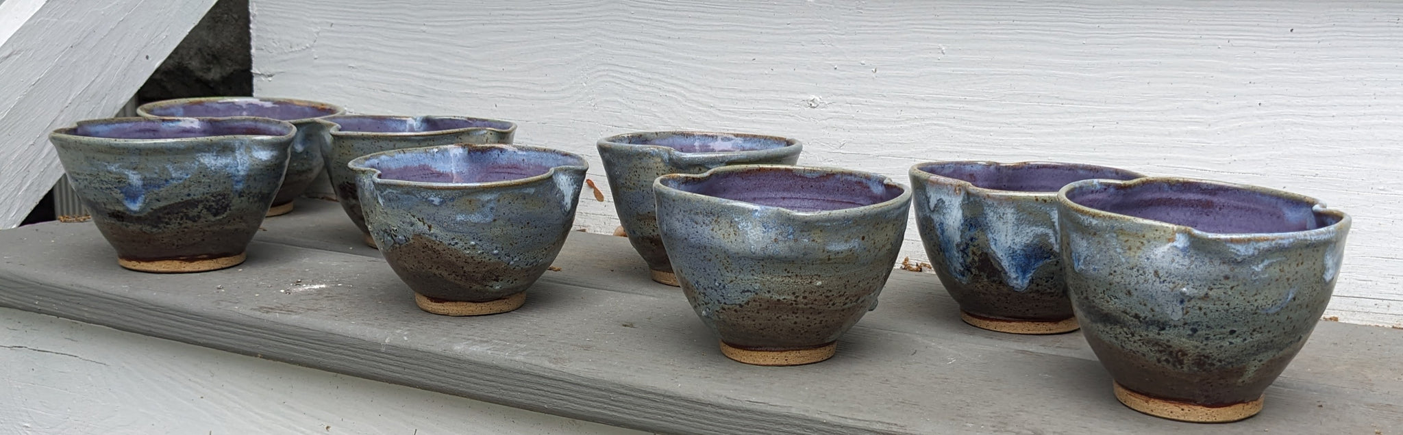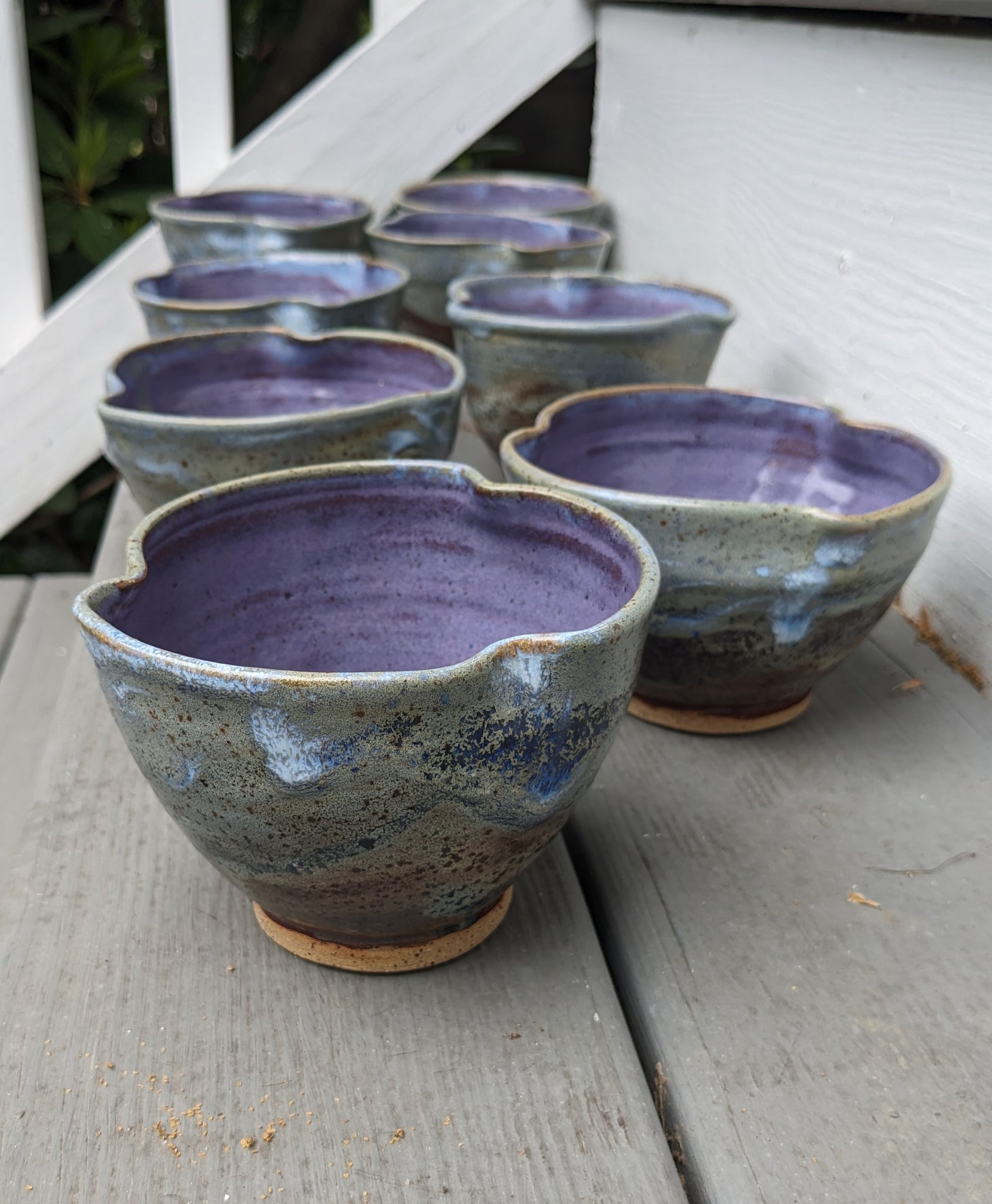 Bowls are approx. 3 1/2 in. tall and 3-4 1/2 in. wide. Blues and browns outside, purple inside.