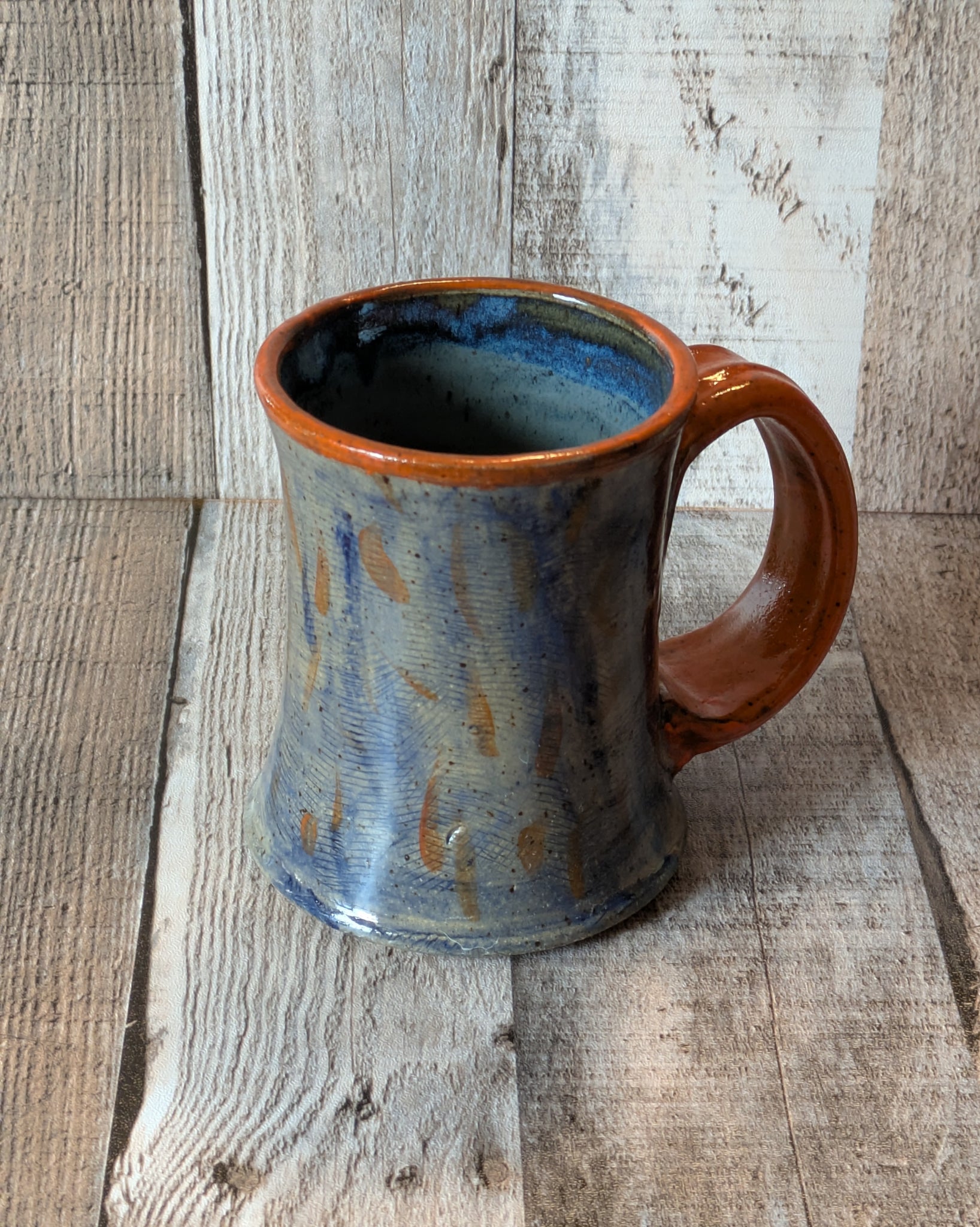 4 inches tall. Blue textured background with orange handle and rim